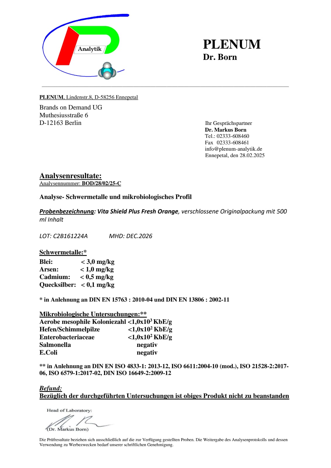 Das Produkt wurde von PLENUM Analytik (Dr. Markus Born, Deutschland) zertifiziert, mit Analysen, die Folgendes umfassen: