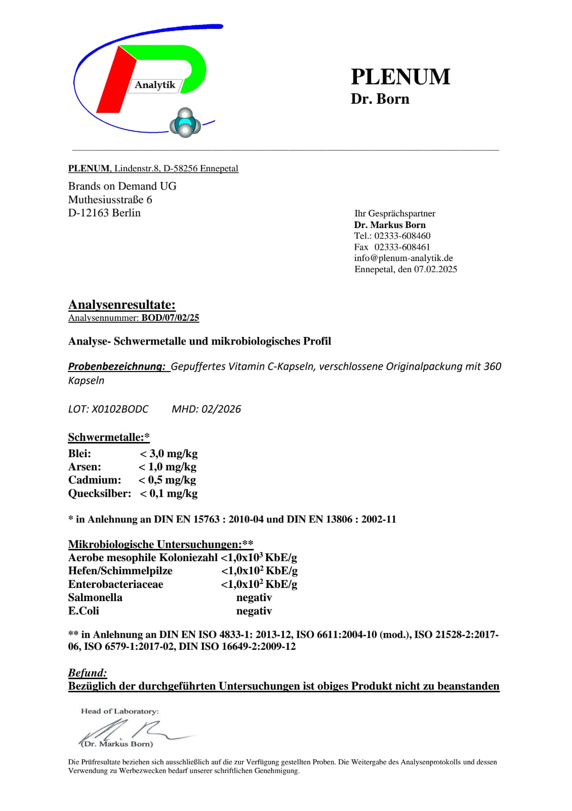 Labor: PLENUM Analytik (Dr. Markus Born) – Analyse vom 02.07.2025 nach DIN- und ISO-Norm.